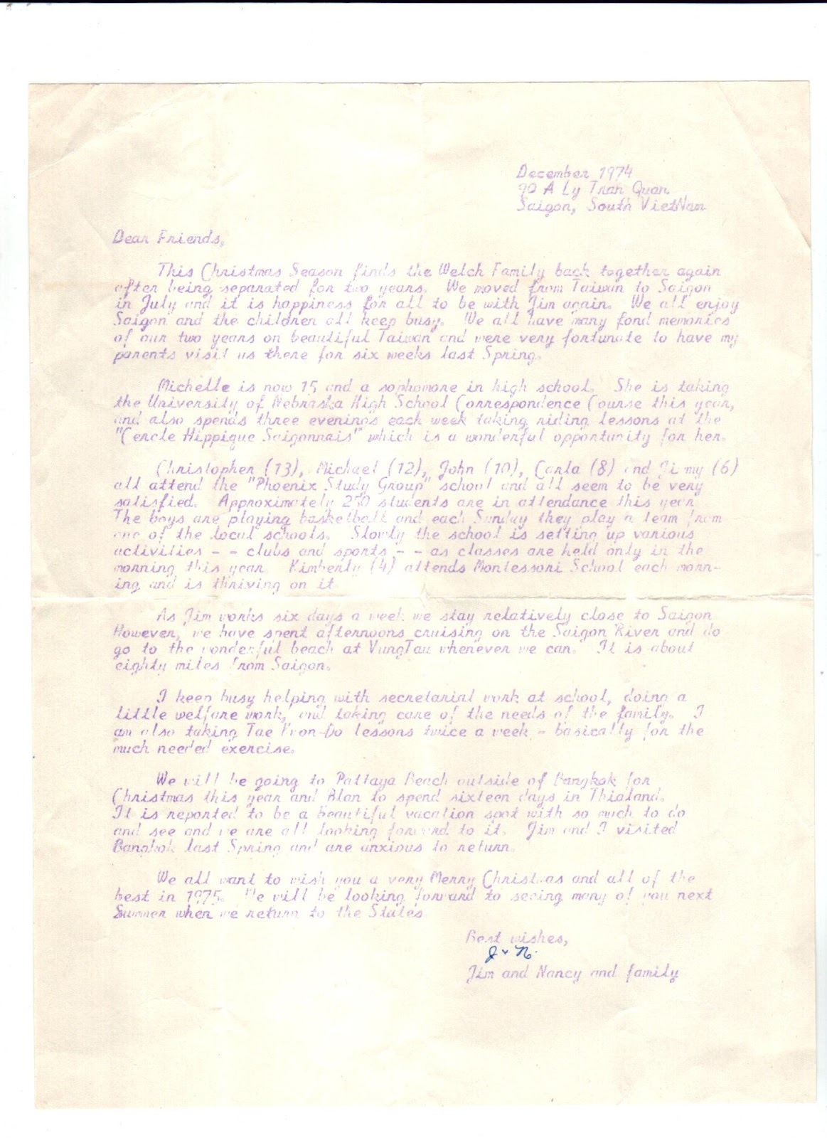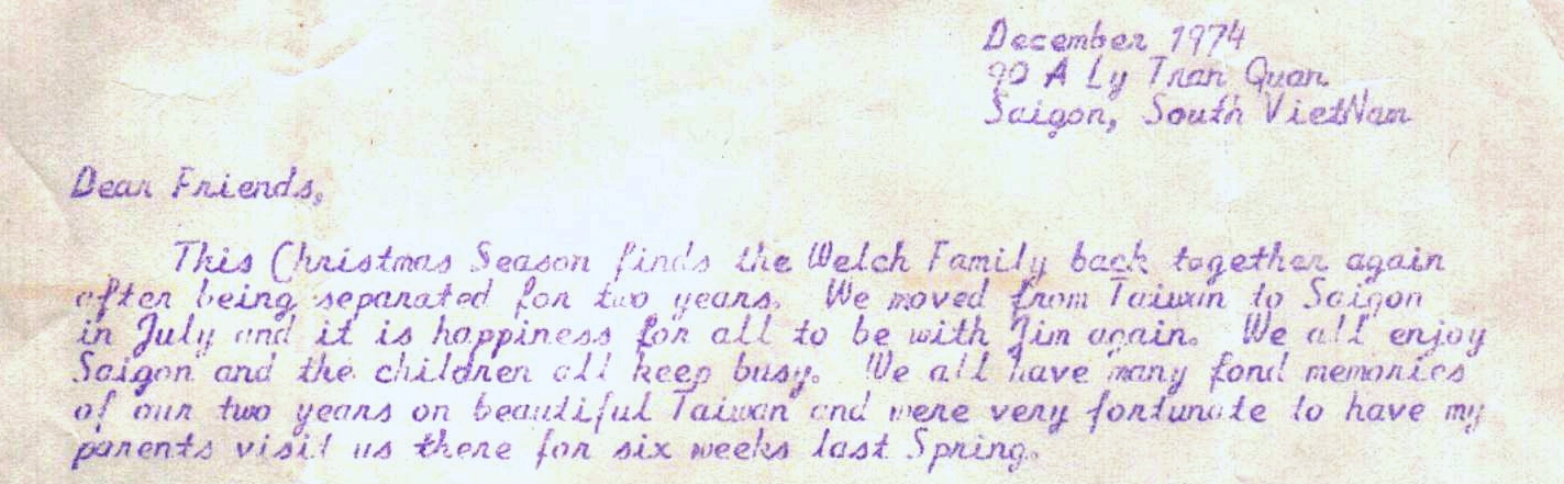 This Christmas Season finds the Welch family back together again after being separated for two years. We moved from Taiwan to Saigon in July, and it is happiness for all to be with Jim again.