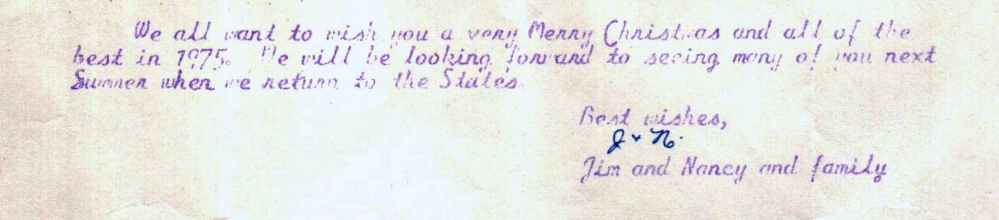 We all want to wish you a very Merry Christmas and all of the best in 1975. We will look forward to seeing many of you next Summer when we return to the States.