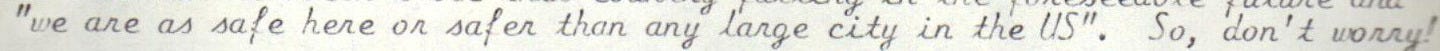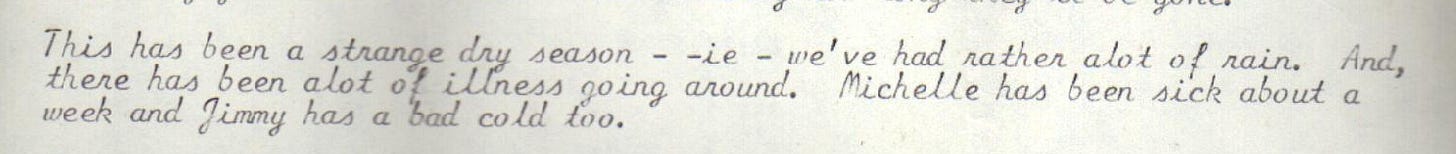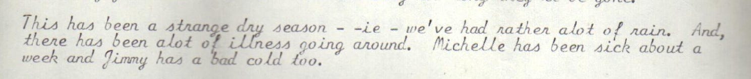This letter from late February 1975 continues the strange clash of images in her missives. On one hand, she begins with “the days are pretty much routine, and we seem to be busy all of the time,” then goes on to finish with this startling paragraph: