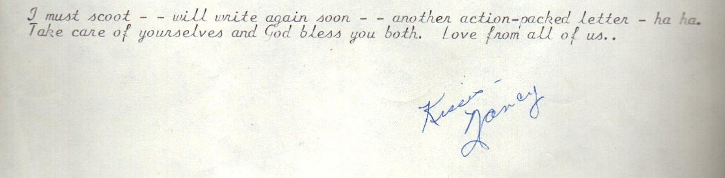 I must scoot—will write again soon—another action-packed letter, ha ha. Take care of yourselves and God bless you both. Love from all of us.